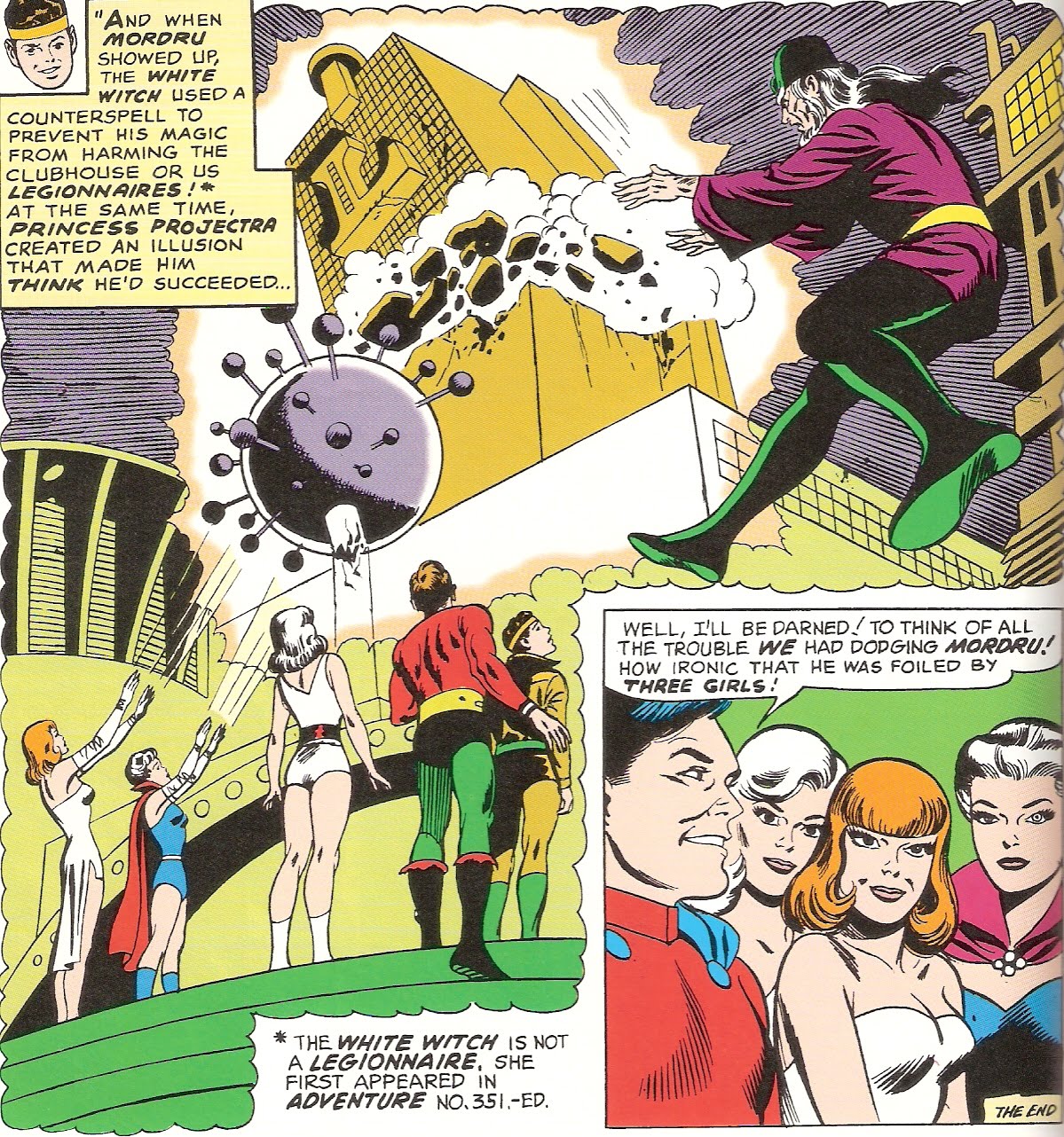 Doug: Encased in a forcefield of Mordru's making, the Legion are powerless. Mordru creates an enormous fireball, but the mass of the construct is too much and the cave begins to collapse on him. Ironically, it's the forcefield that protects the Legion. Once on the surface, they debrief and then head back to the Kents'. There, Superboy turns the hypnosis ray on Lana to make her forget his secret. But when he attempts to turn it on Pete, Mon grabs it from him and turns it on Superboy himself. Mon can't tell Pete why, but tells the reader that in the future Pete will save Superman's life because he knows his secret ID. Back in the 30th Century, Invisible Kid, Dream Girl, and Ultra Boy relate how Dream Girl had prophesied the coming of Mordru. With help from her sister, the White Witch, and Princess Projectra, the Legionnaires were able to create an illusion that made Mordru think that they'd been destroyed. All's well that ends well -- until Mon-el has to go and ruin it with a typical Silver Age sexist comment -- "Well, I'll be darned! To think of all the trouble we had dodging Mordru! How ironic that he was foiled by three girls!"