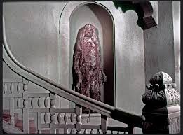 Karen: For Trelane's home, an entirely new set had to be built. 'Trelane's Drawing Room' was a round set -an unusual concept for that time - which designer Matt Jefferies was rightly proud of. The set was also decorated with some recognizable trophies, including the Salt Vampire from the "Man Trap" episode.McCoy does a fun double take at this.